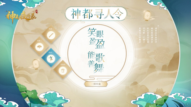 不过,这位神秘嘉宾因为还想继续隐藏在小伙伴中,一起快乐游戏,所以暂时不想暴露身份。小编好不容易才捉到了几条线索,有人物剪影,才艺技能,饮食喜好等等,降妖师们快来神都夜行录悬念站看看小编辛辛苦苦找到的线索吧,说不定他(她)前一天还和你一道在城中自拍合影过呢!