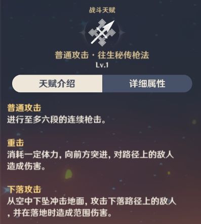 普通攻击进行6段长枪物理攻击,倍率较高,是胡桃解锁1命前的主要输出方式;重击消耗25点体力向前戳刺,在解锁1命后将会转变为主要的输出方式。