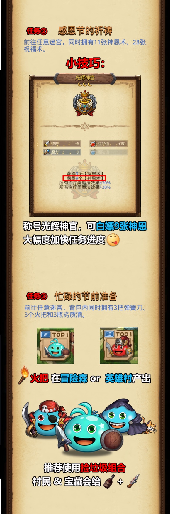 攻略:火把在冒险森和英雄村产出,推荐使用捡垃圾组合,村民和宝藏会给弹簧刀和劣质酒。