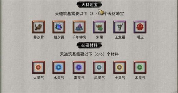 炼气满级在突破「筑基境」选择「天道筑基」,会需要3项「天材地宝」及6项「必要材料」。