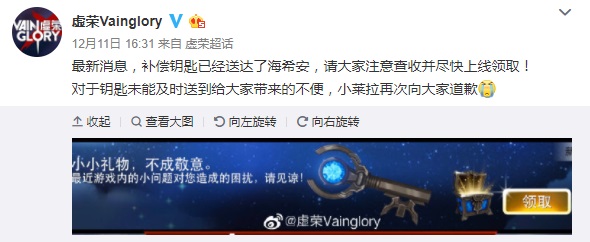 因11月28日游戏无法登陆,为国服玩家申请的专属礼物神秘钥匙两把,虽迟但到,目前已经可以在游戏内商城领取,小伙伴们可别错过了,记得赶快上线哟。