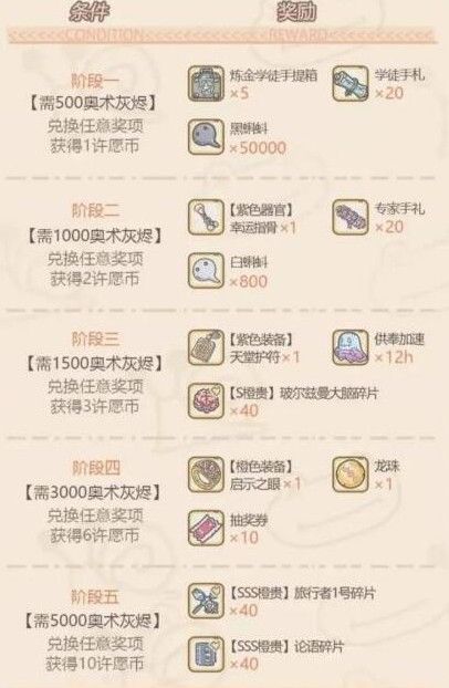灰烬大作战可以兑换奖励,许愿周第二阶段里的紫色贵重品、第三阶段里的s级橙贵、和第五阶段的3S橙贵,每次许愿周都不固定,而其他的都是不变的,大家可以用来参考。