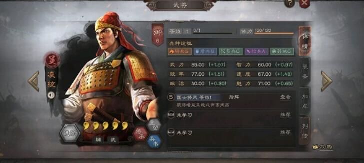 凌统的面板的确算不上非常出彩,属性没有极高成长的项目,适性也仅有骑兵一项S,甚至弓兵适性仅有C级。