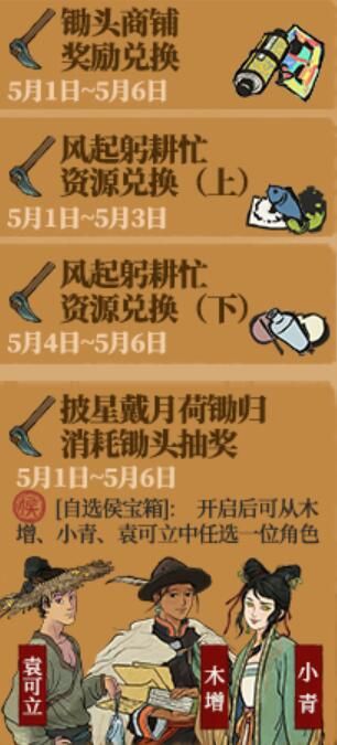 【披星戴月荷锄归】限时抽奖开启,可消耗【锄头】道具抽奖,获取【自选侯宝箱】。【自选侯宝箱】开启后可从木增、小青、袁可立中任选一位角色。