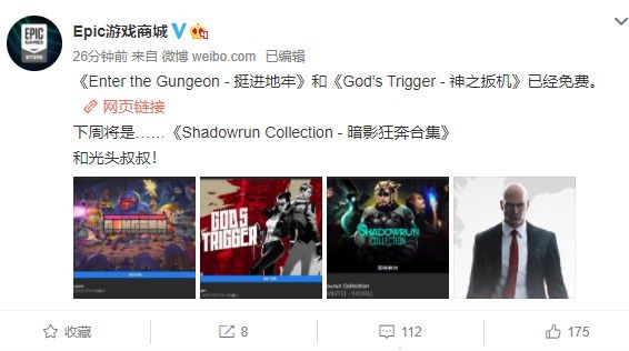 《挺进地牢》《神之扳机》这两款游戏已经可以免费领取了,直接前往Epic游戏商店就能得到这两款游戏,游戏的领取位置下面会分享正确的链接入口,方便玩家们快速找到领取的地方,而下周的免费游戏也进行了预告,是《Shadowrun Collection》和光头叔叔。