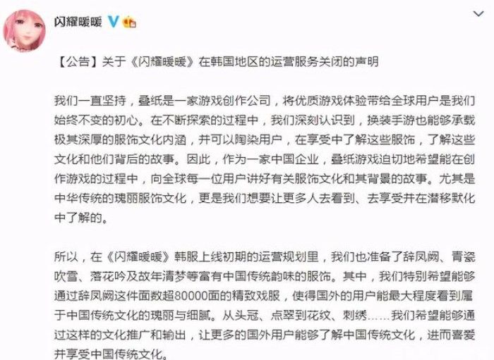 【公告】关于《闪耀暖暖》在韩国地区的运营服务关闭的声明