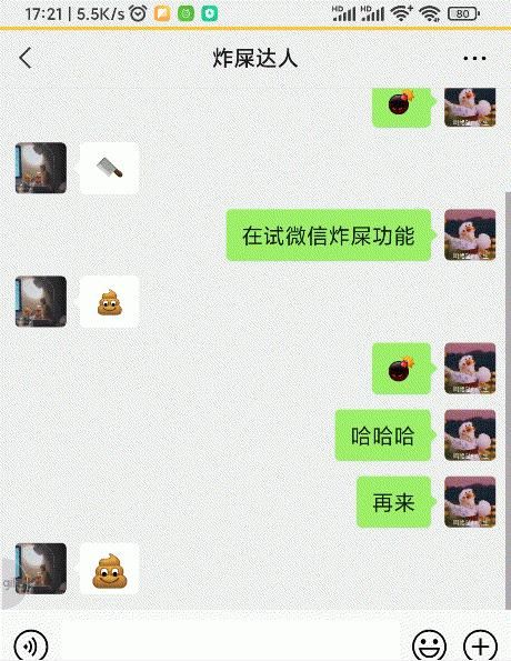 想要触发这个炸屎的动画效果,首先要一方发送“屎”的表情,而后另一方跟着发送出“炸弹”的表情,要快一点,因为是动态表情。