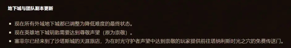 首先是副本难度相关,5H钥匙崇敬变尊敬和天涯旅店新增时光之穴传送NPC之前都已经在PTR测试服验证过,不过“所有地下城都已调整为降低难度的最终状态”这一条小编还是不太理解,因为T4和T5团本早已进行过削弱而T6团本只有一种难度不存在削弱一说,个人猜测这可能是对5H本的削弱,具体改动还要等更新后实测。