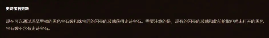玛胖宝石袋和闪亮玻璃现在有机会掉落史诗品质宝石了,但是此改动只适用于更新后获得的,囤货商人这波血亏啊,个人预测P4更新后紫色、蓝色宝石会降价,而绿色宝石会涨价。