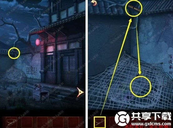 2.用【抽绳】取得墙角的小刀,用【小刀】划开网,取得【带孔木板】和【羊角锤】。