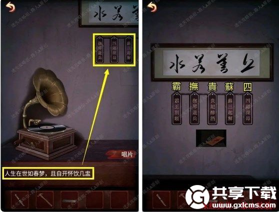 7.上二楼,将【唱片】放入留声机,点击留声机的探针和把手,播放唱片。