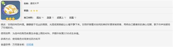 甘雨烹饪「四方和平」时有概率获得【特殊料理】——「盛世太平」,「四方和平」的食谱可在璃月港万民堂「卯师傅」处购买获得。