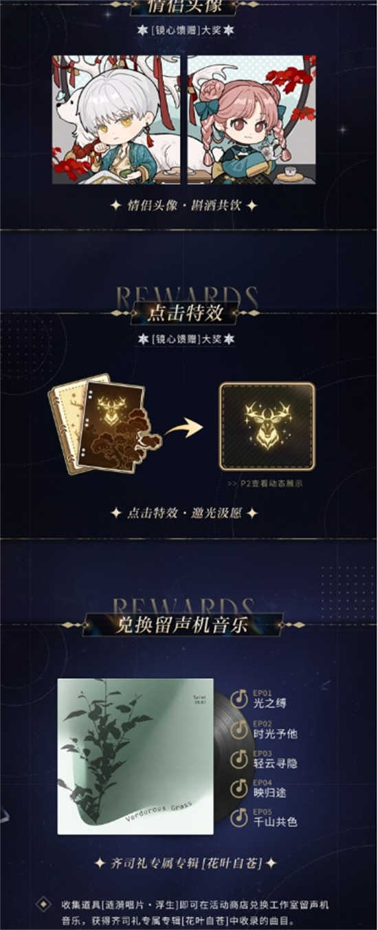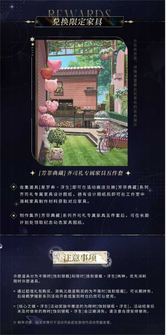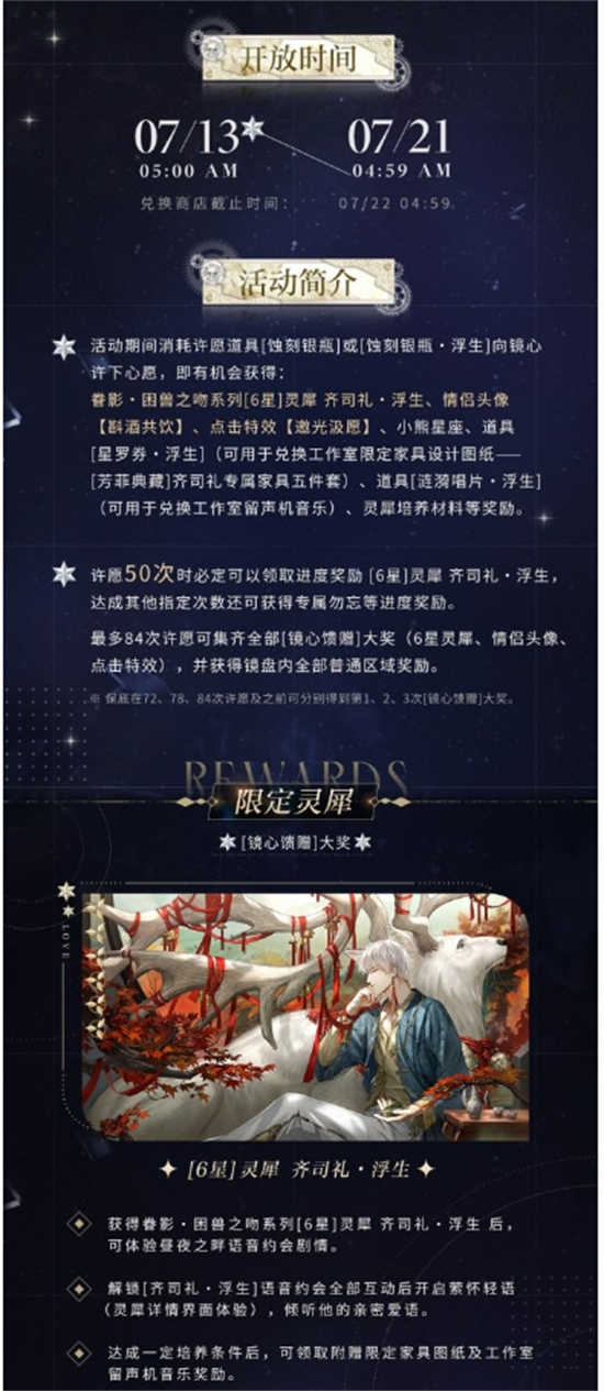 3、活动概要:活动期间消耗许愿道具[蚀刻银瓶]或[蚀刻银瓶・浮生]向镜心许下心愿,即有机会获得眷影・困兽之吻系列[6星]灵犀 齐司礼・浮生、情侣头像【斟酒共饮】、点击特效【邀光汲愿】、小熊星座、道具[星罗券・浮生](可用于兑换工作室限定家具设计图纸——[芳菲典藏]齐司礼专属家具五件套)、道具[涟漪唱片・浮生](可用于兑换工作室留声机音乐)、灵犀培养材料等丰富奖励。