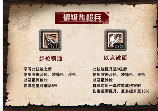 1、初级步枪兵:熟练掌握步枪技能可以提高换子弹的速度,从而在对抗中取得优势。可以用破面技能持续给同一个目标增加伤害加成。可以连续输出对同一目标的伤害加成,直到第六枪开始达到最大值,可以直接用散弹枪叠加。